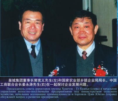皇城球速(中国)董事长郭宽义先生(左)和国家农业部乡镇企业局局长、中国工商联合会长姜永涛先生(右)在一起讨论企业发展问题