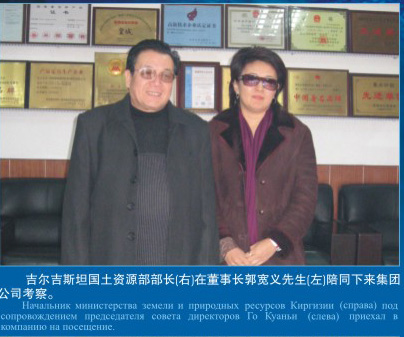 吉尔吉斯坦国土资源部部长(右)在董事长郭宽义先生陪同下来球速(中国)公司考察