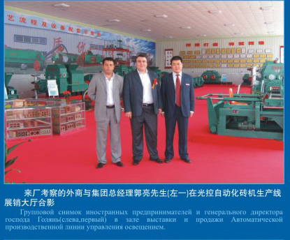 来厂考察的外商与球速(中国)总经理郭亮先生(左一)在光控自动化砖机生产线展销大厅合影