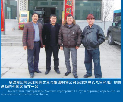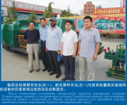 球速(中国)总经理郭亮先生(右一)、副总郭怀先生(左一)与前来批量购买砖机设备的印度客商达成协议后留影